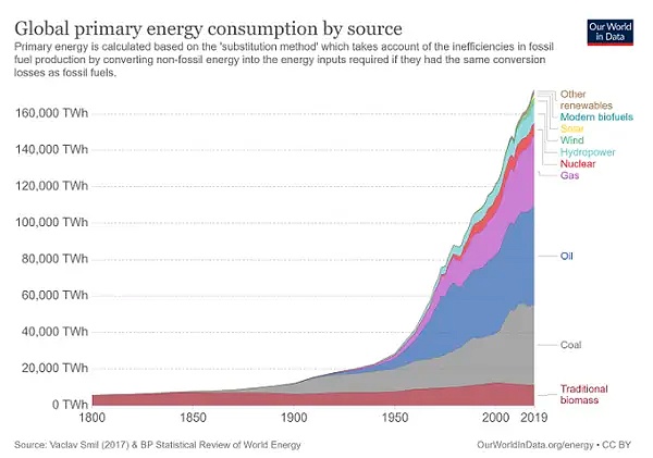 石油是現代工業世界的命脈。雖然它是最值得依賴的能源之一,但石油也是世界上最不受歡迎的行業之一。現實情況是,即使世界轉向使用可再生能源作為主要的能源來源,也總是有使用石油的理由。石油被用于大多數塑料產品、服裝材料、電器、建筑材料,以及最明顯的作為運輸用汽油。石油部門的消費分為以下幾類:運輸(66%),工業(28%),住宅(3%),商業(2%),和電力(1%)。獨立投資分析師和戰略家 Lyn Alden 指出,當考慮未來的能源消費時,重要的是要記住,較新的能源在歷史上并沒有取代以前的能源。以前的能源通常保持平穩,甚至繼續增長,而較新的能源增長更快,變得更有優勢。