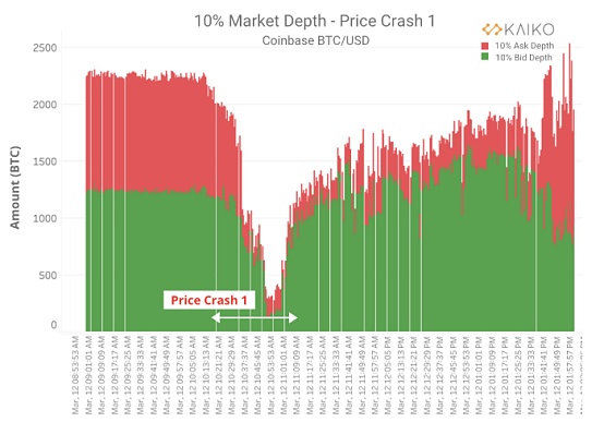 我們繪制了6個交易所的平均每小時10%買入/賣出價的深度,來自Coinbase,Bitfinex,Bitstamp,Bittrex,Gemini和Kraken。圖中第一次崩潰和第二次崩潰被標記了出來,以顯示平均深度在3月12日至3月13日之間是是如何急劇下降的。