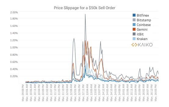 在動蕩的市場中,價差經常會擴大,這表明了價格是快速變化的。3月12日至13日,所有BTC/USD市場的價差大幅擴大導致訂單以遠離中間價的價格水平成交。