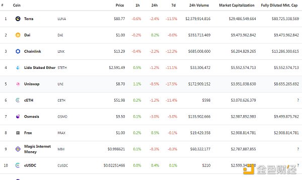 DeFi項目鎖定資產前十排名及鎖倉量 數據來源:defillama