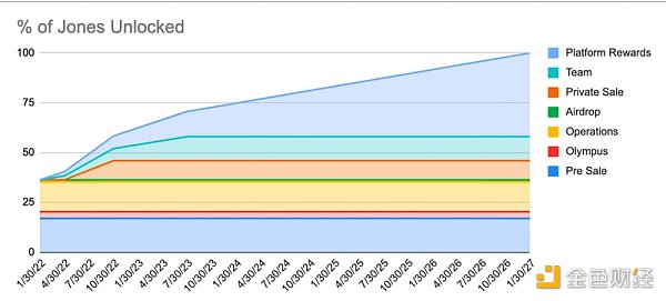 查看代幣的釋放時間表,我們通常需要去查看項目的文檔。下圖是作者制作的JonesDAO代幣釋放圖表。
