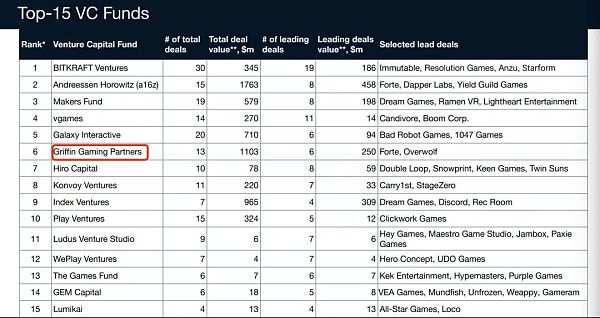 而在旗下第二支基金獲得了 7.5 億美元超額認購后,Griffin Gaming Partners 也迅速增長成為了目前最大的游戲基金。不久前,據 Invest Game 發布的 2021 年游戲投資數據,Griffin 在游戲領域前 Top 15 VC Funds 中還只排在了第六位。