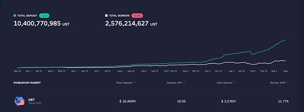 在Terra生態中,借貸協議Anchor作為“國有銀行”,承諾了19%-20%的超高活期收益率,以此吸收公眾存款(以UST的形式)。根據Coingecko數據,目前UST總流通為150億美金,官方基金的社區池擁有21億UST,而在Anchor中存款的UST為104億,占到扣除官方資金的UST總市值的80.6%,流通中的大部分UST都是為了獲得Anchor的高息而來。