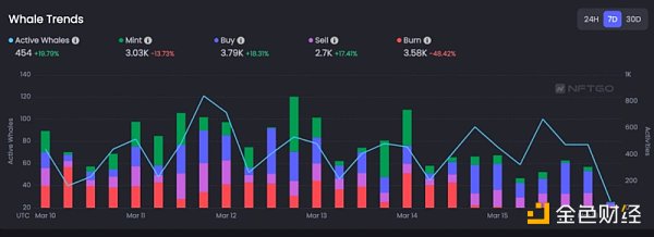 然而,大多數巨鯨依舊堅持持有各自的NFT。如果我們關注巨鯨行為及其利潤指標,可以看出市場下巨鯨Mint次數下降,而買賣行為持續增加。