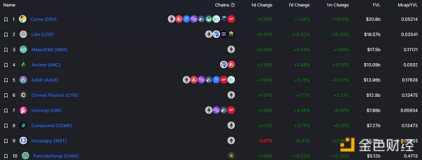 DeFi項目鎖定資產前十排名及鎖倉量 數據來源:defillama