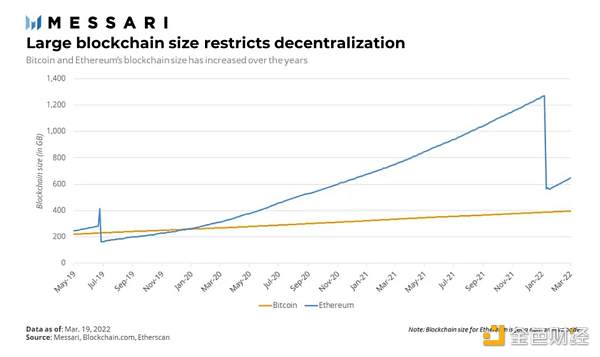 比特幣和以太坊等老一代區塊鏈繼續受到低可擴展性的影響,因為它們優先考慮去中心化。然而,即使這些區塊鏈的去中心化也面臨壓力,因為它們的大小現在超過了數百 GB,從而提高了運行完整節點的要求。然后將責任留給有能力為去中心化的良好事業花費大量資源的愛好者。在博客文章“區塊鏈可擴展性的限制”中,Vitalik Buterin 警告不要顯著增加區塊鏈的參數以滿足對區塊空間的需求,因為如果普通用戶無法運行節點,這可能會導致“極端中心化”。