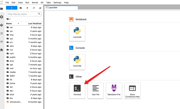 進入JupyterLab頁面后,我們先點擊Terminal進入終端,并輸入下面指令。