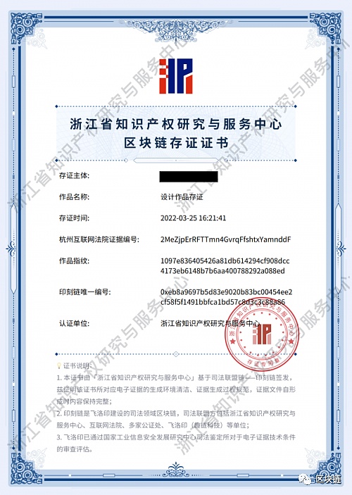 此外,證書基于長三角影響力最大的司法服務聯盟鏈“印刻鏈”,聯合浙江省知識產權研究與服務中心以及鏈上公證節點共同出具,面向社會提供公開、便捷、權威的區塊鏈知識產權存證確認服務。