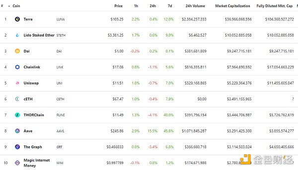 DeFi項目鎖定資產前十排名及鎖倉量 數據來源:defillama