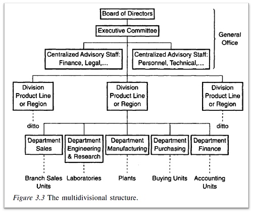 Ronald Coase 從 19 世紀末到 20 世紀 50 年代對大型集中式公司結構 (比如通用汽車、標準石油和杜邦) 的歸納觀察,發展了他的公司理論。這些大公司以 U 型結構建立起來 (其特點是企業實行集中控制和統一指揮),這種結構成為現代工業資本主義的代名詞,也是幾十年來最常見的組織結構,直到今天也是如此。