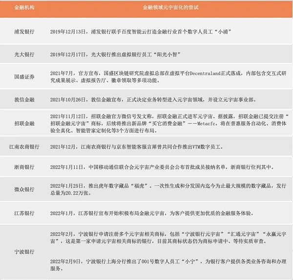 除了上述提到的百信銀行和工商銀行分行,目前國內許多金融機構已經透露出進軍元宇宙的決心,部分機構也已經初步打造相關的元宇宙場景。