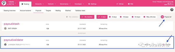 Payouts 通常在每個 ear 結束后由驗證人完成。如果你的驗證人尚未開始領取獎勵并且你迫不及待想要領取,你可以通過點擊右上角的 payout 按鈕或 pending payment 旁邊的按鈕來開始領取。請注意,這將花費你的交易手續費。如果你不著急,只需等待驗證人(或其他人)來領取。