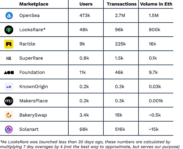 OpenSea 已經是NFT 市場中的主導力量。然而,他們面臨的市場新晉黑馬 LooksRare 真實有力的威脅。這個最近推出的 NFT 市場相較于OpenSea來說有很多優勢:費用低于 OpenSea,并且擁有原生代幣,這大大增加了它對加密原住民的吸引力,除此之外他們還與代幣持有者分享其所有手續費。從前面的表格中可以看出,LooksRare 已經超越了所有其他平臺,并且正在接近 OpenSea 的交易量和交易金額。