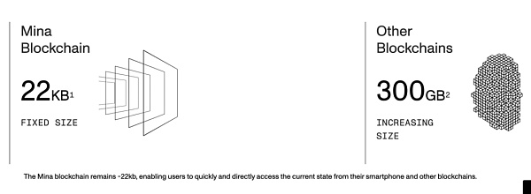 Mina 的核心理念是「簡潔的區塊鏈」,整個 Mina 網絡中處理的所有交易所占區塊的大小都被限定在 22 KB。且最新的區塊中會包含整個區塊鏈的最新狀態,用戶只需一個zk-SNARK證明就可以在幾毫秒內完全驗證當前區塊鏈的狀態。