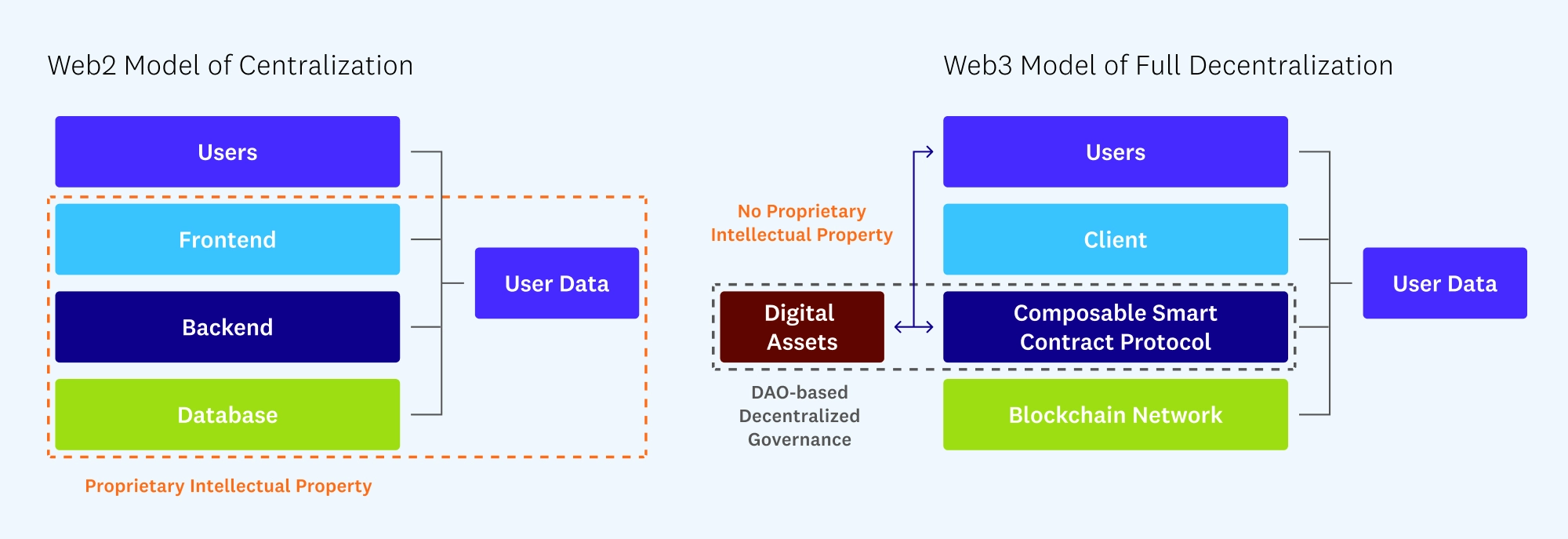 完全去中心化是目前 DeFi 領域內最常見的去中心化模式。正如下面的圖片所反映的,從中心化模式(如 Web2)到去中心化模式(如 Web3)的轉變涉及到: