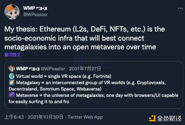 一個在文化或經濟上產生聯結的虛擬世界集群,是「元銀河系」,比如以太坊上正在崛起的 VR 項目;