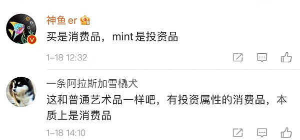 關于NFT究竟是消費品還是投資品的問題,眾人看法各不相同。資深礦工神魚認為,買是消費品,mint(鑄造)是投資品。
