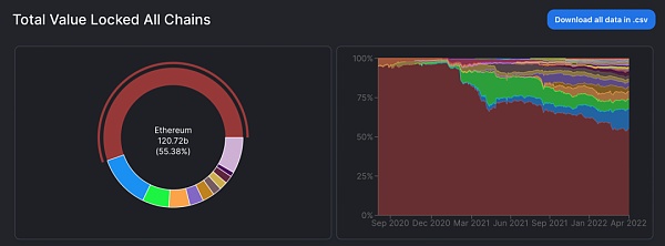 目前,各公鏈上的DeFi項目數量,已經超過1000個。截止2022年4月11日,DeFiLlama數據顯示,按照DeFi總鎖倉量(TVL)排名前十的公鏈分別是以太坊(55.38%)、Terra(12.45%)、BSC(6.19%)、Avalanche(4.87%)、Solana(3.22%)、Fantom(2.78%)、Polygon(1.99%)、Tron(1.9%)、 ?Cronos(1.81%)、Arbitrum(1.08%)。以太坊的DeFi鎖倉總量占比相對來說有所減少,較去年12月下降8%左右。這說明公鏈的市場份額在被其它公鏈所“蠶食”,以太坊的市場主導地位有所下降。
