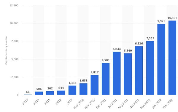 2013年到2022年2月世界加密貨幣的數量