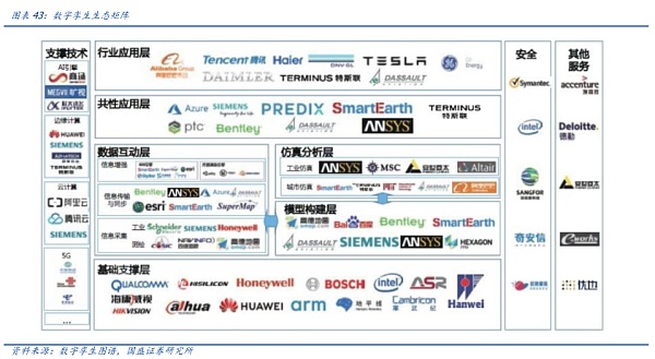 目前,數字孿生主要涉及到3D仿真技術,三維地理空間,數據可視化和IoT物聯接入這些技術,已被廣泛應用于各大行業。尤其是智能制造和智慧城市領域,生態系統架構雛形已現。