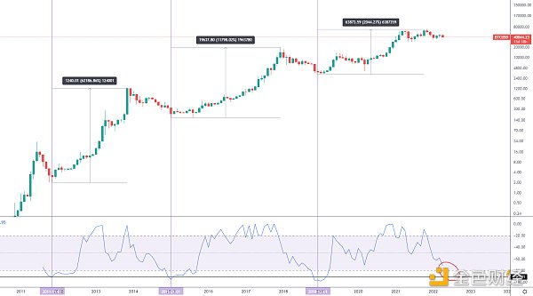通過威廉姆指數可以看出,歷史上每次該指數從高位回落至下方水平線以下,意味著BTC到達這一輪熊市的大底區域,例如2011年、2014年和2018年熊市,后面BTC在這一帶震蕩筑底后啟動新一輪牛市行情,目前該指數從前頂高位回落到現在一直保持下滑姿態,距離下方平衡線還有一段距離,所以BTC目前可能還沒到達真正底部區域,前段時間反彈或為階段性超跌反彈,后市將可能再次探底,還是要注意風險。