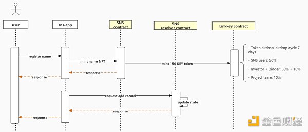 SNS(社交名稱系統)是LinkKey中一個非常重要的分散式用戶名系統。該協議規定,所有用戶名都是***.key,例如alice.key,1個密鑰只能綁定1個ETH(ERC20),該名稱將自動生成為NFT,未使用的名稱可以自由傳輸和交易。如果個人NFT和社區NFT是通過sns發放的,則無法交易該名稱。