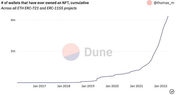 上圖:持有 NFT 的累計錢包數量增長情況,來源:Dune Analytics