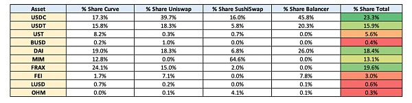 深入到每個交易所的穩定幣流動性的構成,我們可以看到,USDC 是迄今為止在 Uniswap 和 Balancer 上流動性最強的穩定幣,分別占到這兩個 DEX 上的 39.7% 和 45.8% 的穩定幣流動性份額。如上圖所示。