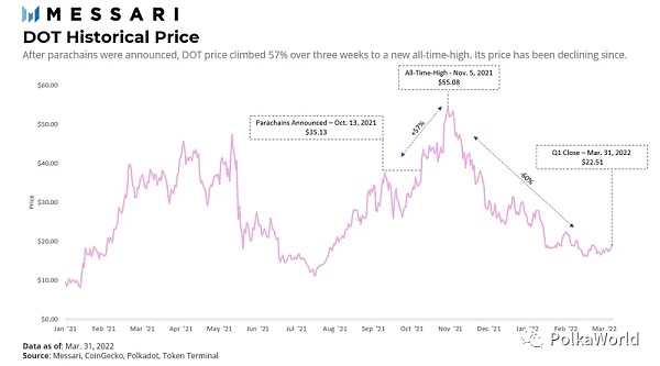 平行鏈的概念最早是在 2016 年的波卡白皮書中引入的。2021 年 10 月,在 Substrate Sub0 會議上,聯合創始人 Robert Habermeier 宣布中繼鏈已準備好支持平行鏈。在接下來的三周里,Polkadot 的原生代幣 DOT 的價格在 2021 年 11 月 5 日上漲了 57% 至歷史新高 55.08 美元(市值 565 億美元),也就是社區批準第一個平行鏈插槽 auction 的第二天 —— 2021 年 11 月 11 日。然而,從 2021 年 11 月到 2022 年第一季度,Polkadot 以及更廣泛的加密市場的估值有所下降。截至 2022 年第一季度,DOT 為 22.5 美元(233 億美元市值),比歷史最高點下跌 60%。