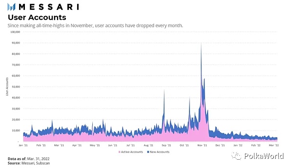 Polkadot 用戶賬戶,無論是新增的還是活躍的,都遵循與價格類似的路徑。11 月,用戶賬戶平均水平和年初相比增長了 131%,并創下多個歷史新高。然而,自 11 月以來的每個月,活躍用戶和新增用戶賬戶都在下降。盡管用戶帳戶下降是一個普遍的宏觀主題,但也有一些內部原因。
