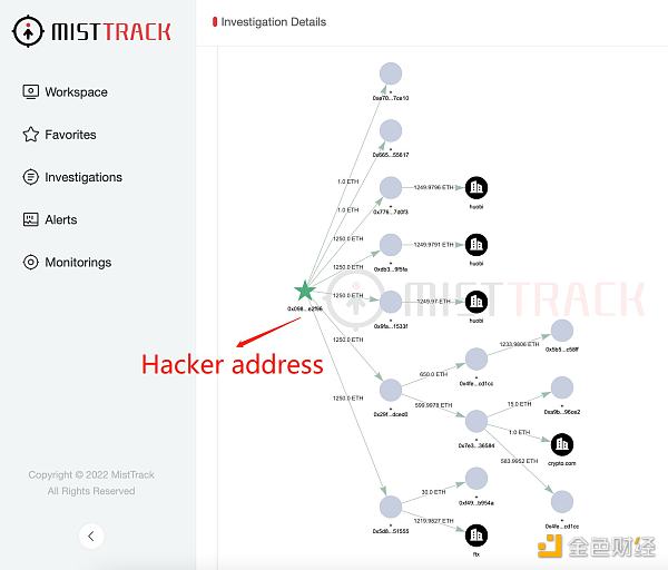 3 月 30 日,慢霧發文稱,此次黑客攻擊的資金來源于幣安提幣,且已將 2550 萬枚 USDC 交易為 6250 枚以太坊,并進行了分散轉移,其中 1221 ETH 轉移到了 FTX 和 Crypto.com。
