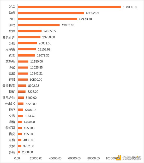 從三級行業的融資金額來看,DAO和DeFi相關的融資金融較高,分別占區塊鏈行業融資金額的17.25%和11.12%。NFT、游戲和元宇宙等鏈上應用場景也有不俗表現,基礎設施/技術解決方案上,隱私計算、數據、存儲和web3.0也是熱門的投資賽道。