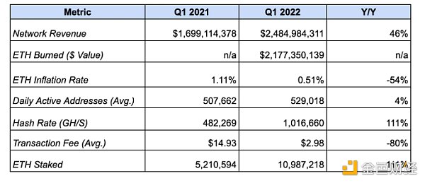 這些數據比較了 2021 年第一季度和 2022 年第一季度以太坊的表現。