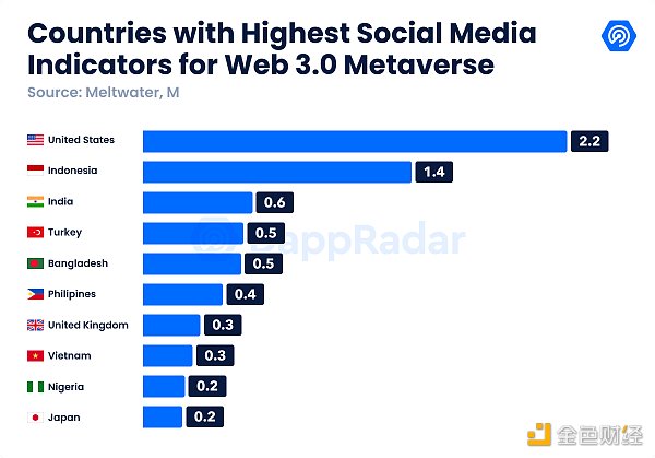 據報道,在過去十年中,巴西雷亞爾 (BRL) 對美元的 217.65% 通縮是影響 45% 的參與者的一個影響因素,他們正在考慮在未來一年內購買數字資產以緩解通縮壓力。同樣,印度的法定貨幣盧比 (INR) 在通縮 58.58% 后,加密貨幣的興趣增加了 40%。在標題為 “Web3 元宇宙社交媒體指標最高的國家” 的類別中,美國以 2.2 分排名最高,其次是印度尼西亞和印度,分別為 1.4 和 0.6,英國以 0.3 排名第七。