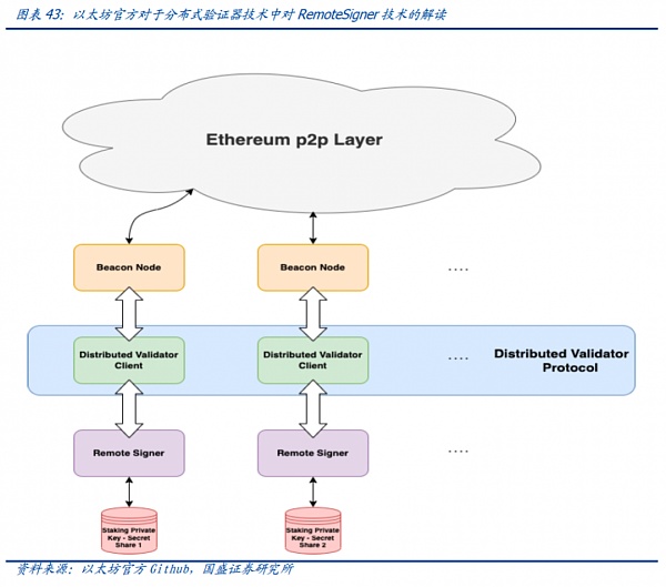SSV還獲得了以太坊官方的認可。DVT技術一開始便位于以太坊創始人V神的計劃路線圖中合并階段的最上層。2022年1月,來自以太坊基金會的ETH核心開發者Tim Beiko加入了SSV DAO多重簽名錢包(SSV金庫)的簽名委員會,共同驗證和執行社區通過的提案。2022年2月,以太坊官方在Github上公布的DVT技術標準框架上,不僅拋棄了原先所使用的中間人驗證節點技術,轉而改為了SSV的遠程簽名模式,而且還官宣了SSV作為DVT技術供應商與以太坊2.0客戶端Prysm的交互實現。