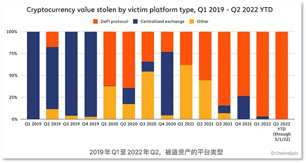 Chainalysis指出,從2020年初以來,在所有加密貨幣平臺被盜的資金中,DeFi 協議所占的份額就在不斷增長,并在2021年損失了絕大多數的被盜資金。截至 5 月 1 日,2022 年被盜的16.8億美元加密資產中,DeFi 協議占到了97%。?