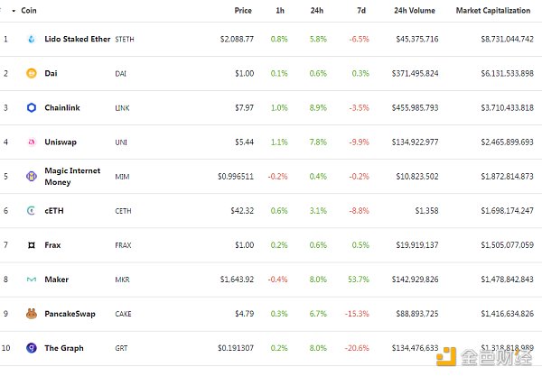 DeFi項目鎖定資產前十排名及鎖倉量 數據來源:defillama