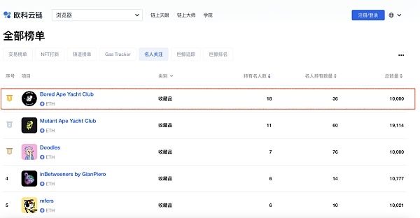 在歐科云鏈NFT專題榜單下的“名人關注”項目里,無聊猿NFT項目的名人持有數位列榜單第一,共有18位名人持有無聊猿。位列榜單第二、第三的Mutant Ape Yacht Club和Doodles也是目前市場上的熱門項目,持有名人數分別為11位和7位。