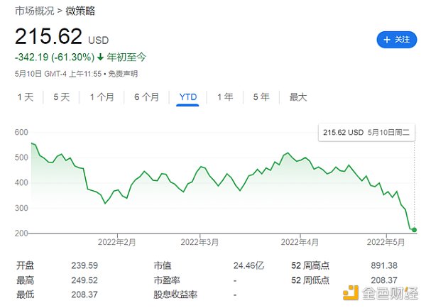 在美聯儲緊縮政策之下,風險資產比特幣價格持續下跌或許也是意料中事。然而隨著比特幣價格持續下跌,全球持有比特幣最多的上市公司、商業智能公司微策略公司MicroStrategy股價周一暴跌24%,達到2020年以來的最低水平,周二美股開盤繼續走低,截止發文跌幅超1.5%,報215.62美元。年初至今,微策略累計跌幅已達超60%。