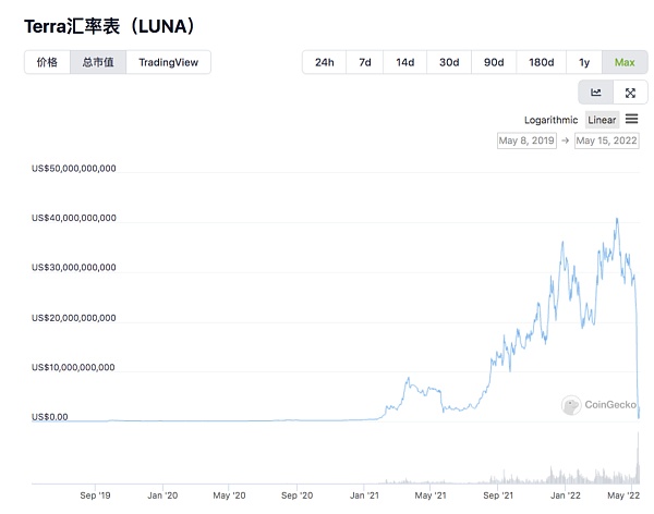 一款名為LUNA的虛擬貨幣價格以近乎直線的形態下跌。從5.8美元左右下跌至0.05美元,跌幅高達99%。而3天前,其價格還高達60美元。
