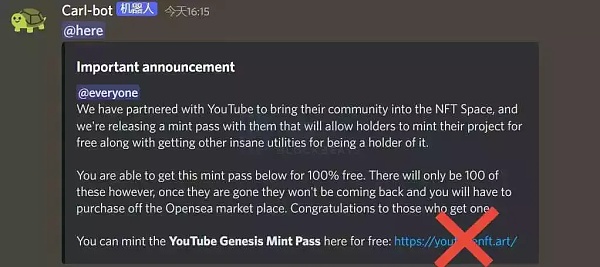 2022年5月6日,NFT交易市場Opensea官方Discord遭受攻擊,黑客利用機器人賬號在頻道內發布虛假鏈接,并聲稱“OpenSea與YouTube達成合作,點擊鏈接可參與鑄造限量100枚的mint pass NFT”。