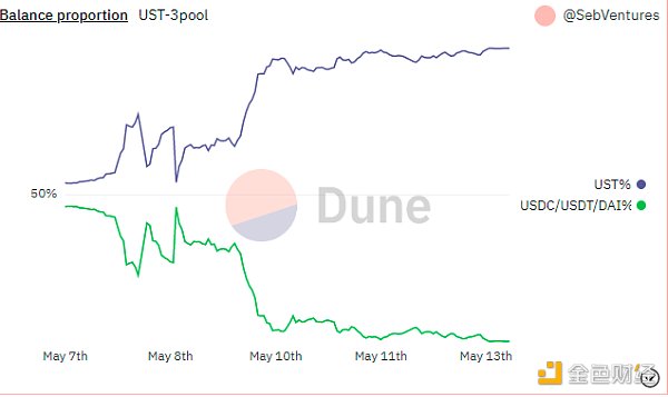 2、鏈上流動性也完全枯竭,UST-3pool池中UST比例達到97-98%。