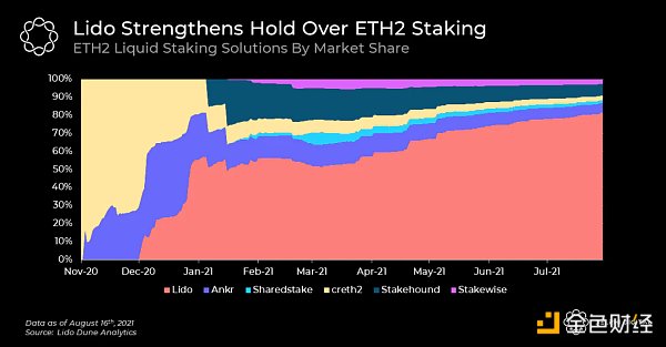 接下來的幾個圖表顯示,Lido 主導了 ETH 的質押市場,并確保了很大一部分市場份額。