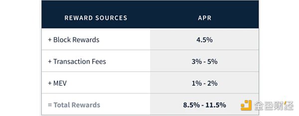 目前,在不扣除服務器成本的前提下,在以太坊上進行質押的用戶將獲得約 4.2% 的年利率。Kraken 在《2022 年第一季度質押狀況》的報告中預計,在以太坊主網合并后,質押用戶的年利率將增加到 8.5%-11.5%。