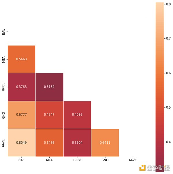 對于 Balancer 進行的財庫互換,我們檢查了 BAL、MTA、TRIBE、GNO、PRIME 和 AAVE 的每日價格數據,并比較了可追溯到 2021-04-03 的對數回報的相關性。結果如下面的相關矩陣所示: