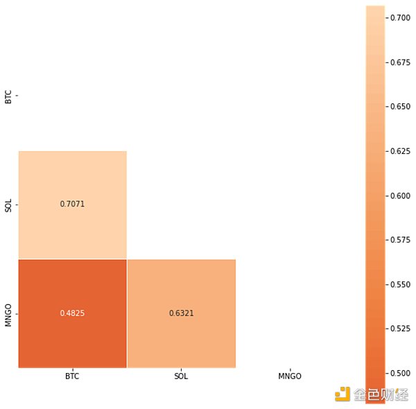 盡管 Mango 最近的財務管理活動并不真正構成互換,但我們認為,在我們回答回報相關性是否強的問題時,值得研究其購買 Marinade 質押的 SOL 而不是其最初購買 BTC 的計劃的決定 在 L1 生態系統中。我們檢查了可追溯到 Mango 代幣下降(2021 年 9 月)前后的每日日志返回,以了解 BTC、SOL 和 MNGO 之間存在哪些相關性。具有 R2 值的相關矩陣如下圖所示: