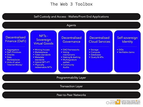 區塊鏈投資機構 Outlier Ventures 創始人 & CEO Jamie Burke 在《Depth is what leads to Metaverse Operating system of?》一文中將 Web 3 的詳細技術構建歸納為 Web 3 工具箱。站在區塊鏈和去中心化的核心視角,Web 3 工具箱自下而上依次為:點對點網絡、交易層、可編程層、去中心化應用層、代理、錢包等六大層。