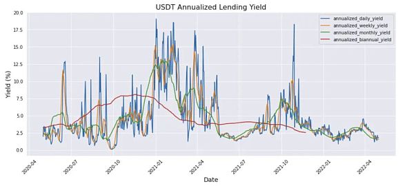 下表的平均利率也證實了GC利率平均在0.08%左右,而USDC和USDT在這段時間的貸款收益率分別為3.71%和4.51%,如下圖所示。(我們還查看了2020 - 05年2年期國債收益率,僅為0.2%)。