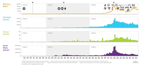 第三個周期則在 2017 年達到峰值,這是加密貨幣市場的廣泛影響引起主流關注的時候。這個周期又一次使開發者和創業公司數量大大增加,高達十幾倍左右。加密貨幣市場也從邊緣行業變為一個真正的創業行業。