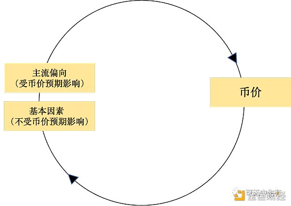 了解了這兩大區別,我們來看一個完整的幣圈周期產生的原因:首先假設基本因素不變,但市場預期幣價漲所以主流偏向在加強,這會導致真實幣價的上漲。而幣價的上漲會通過激勵更多驗證節點、社區活躍度和新用戶人數等來使得項目基本面變好;同時主流偏向會自我強化繼續預期幣價上漲,基本面和主流偏向的上漲進一步帶動幣價上漲。趨勢一旦建立起來,就會自我保持、自我發展,直到轉折點出現。當投機性資本流入無法補償使用需求減少帶來的資本流出、宏觀 / 法律環境變化帶來的投資性資本流出、上漲的待償付利息 / 債務時,這個趨勢就會逆轉。此后,又向相反方向啟動一個自我加強的過程。預期的下跌帶來主流偏向的強化,導致幣價下跌;下跌的幣價又會影響礦工和節點的積極性、項目方的積極性和新用戶的數量,從而使得基本因素變差,帶來幣價的進一步大跌,進入死亡螺旋。